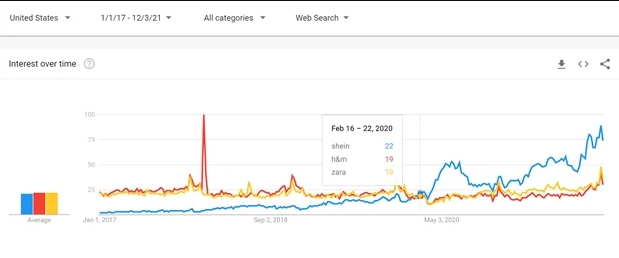 طبق دادههای Google Trends (شکل 3)، علاقه جستجوی کاربران آمریکایی به Shein از علاقه آنها به H&M و Zara در طول همهگیری فراتر رفت.