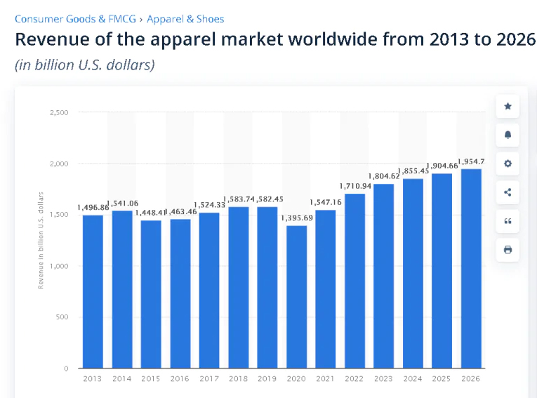 اول از همه، همانطور که مطمئن هستیم شما می دانید، بازار مد گسترده است. به طور خاص، در سال 2022، درآمد این بخش از 1.7 میلیارد دلار فراتر رفت و تا سال 2026، انتظار میرود که بخش جهانی مد به ارزش 1.7 تریلیون دلار برسد.