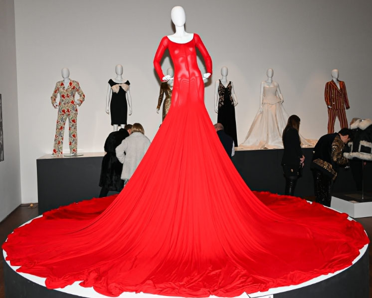 Among those were a Halston everyday utility look, a Tom Ford sequin gown, a Diane von Furstenberg gold wrap gown, an Isaac Mizrahi bow dress, and Mary McFadden gown. Contemporary designs such as a Khaite white sequin gown, a Rick Owens denim tech sheath, and a Proenza Schouler eyelet dress were also displayed