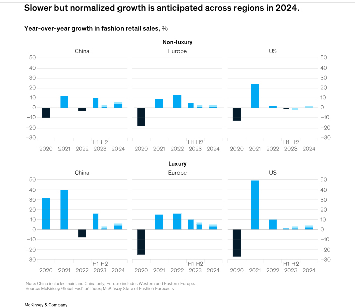 بر اساس تجزیه و تحلیل مک کینزی از پیشبینیهای مد، صنعت جهانی در سال 2024 بین 2 تا 4 درصد رشد خواهد داشت (نمایشگاه)، با تغییرات منطقهای و کشوری. بار دیگر، انتظار می رود که بخش لوکس بیشترین سهم از سود اقتصادی را ایجاد کند. با این حال، حتی در آنجا، شرکت ها توسط محیط سخت اقتصادی به چالش کشیده خواهند شد. پیشبینی میشود که این بخش در سطح جهانی بین 3 تا 5 درصد رشد کند، در حالی که این بخش در سال 2023 به میزان 5 تا 7 درصد رشد میکند، زیرا مصرفکنندگان پس از افزایش پس از همهگیری هزینههای خود را مهار میکنند. رشد اروپا و چین کاهش می یابد، در حالی که انتظار می رود رشد ایالات متحده پس از سال 2023 نسبتا ضعیف افزایش یابد، که منعکس کننده چشم انداز کمی خوش بینانه تر است.