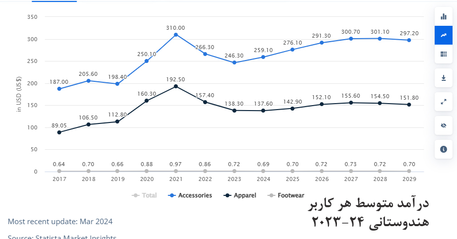 بازار خردهفروشی آنلاین مد هند شاهد رشد قابل توجهی در بخشهای مختلف مانند لباسهای داخلی، لباسهای ترکیبی قومیتی، فرهنگ کفشهای کتانی و بازارهای روستایی است. لجستیک و سیستم های پرداخت دیجیتال چالش های کلیدی برای فروش تجارت الکترونیک هستند. مد پایدار، از جمله مد اکو و مد اخلاقی، در بین مصرف کنندگان محبوبیت پیدا می کند. پارامترهای کلیدی مانند پنبه ارگانیک، بامبو، کتان، مواد بازیافتی و رنگهای کمضریب این روند را هدایت میکنند. صنعت پوشاک با چالشهای مرتبط با استفاده از آفتکشها، کودها و زبالههای مصنوعی مواجه است که منجر به آلودگی و مصرف بالای آب و انرژی میشود. شرکتکنندگان کلیدی شامل پورتالهای خرید آنلاین، طراحان مد، و فروشندگان کلیدی هستند. خردهفروشی همهکانالی و تجهیزات متمرکز بر عملکرد مانند لباسهای ورزشی، لباسهای اوقات فراغت و لباسهای رسمی دستههای محبوبی هستند. جمعبندی دادهها از منابع متعدد نشاندهنده آینده امیدوارکنندهای برای صنعت، با تمرکز بر شیوههای کار منصفانه و لباسهای کاربردی است.