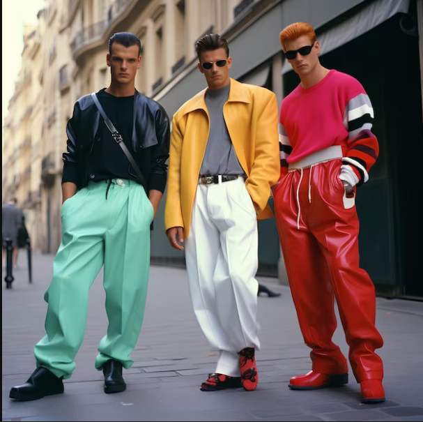 در ایالات متحده، اتحاد جماهیر شوروی، آفریقای جنوبی، مصر و ژاپن، گرایشهای رایج شامل لباسهای با طرح هندسی جسورانه در رنگهای آبی برقی، نارنجی، صورتی فلورسنت، بنفش، فیروزهای و لباس سبز اسیدی بود که توسط لیزا لوپسوف TLC رایج شد. الگوهای معمولی شامل مثلث، صاعقه زیگزاگ، الماس، پاستیل، مستطیل، شکلهای آزاد همپوشانی، انفجارهای شبیهسازیشده با الهام از تصاویر کتابهای مصور یا هنر پاپ، شبکههای پیچیده، و خوشههایی از خطوط موازی نازک در رنگهای متضاد (مثلاً سفید، سیاه و زرد در زمینه فیروزه ای). بسیاری از زنان پیراهن های جین دکمه دار، شلوار جین رنگی به رنگ سبز متوسط و تیره، قرمز و بنفش، شلوار شلوار اسپندکس متالیک، شلوار جین، شلوار جین رنگی، شورت دوچرخه، کت چرم مشکی با پد شانه ای، مچ پا بلند می پوشیدند. شلوار جین بلند (معروف به جین مامان) و شلوار هر دو مدل ساده یا لباسهای چیندار، عروسکی روی شورت دوچرخه یا ساقهای کاپری، و لباسهای اسکیت باز. تاپهای نئونی و گرمکنها، همراه با دامنهای طرح پلنگی، بلوزهای ساتن یا ریون براق، شلوار جین گلدوزیشده با بدلیجات، و پیراهنهای سیاه یا سفید، شلوارهای ساق پا و کتهایی که با طرحهای هندسی انتزاعی قرمز، آبی، زرد و سبز چاپ شده بودند، محبوب بودند. در آمریکا، لوازم جانبی محبوب شامل کفش مجلسی، چکمههای کابویی، روسری، جورابهای شلخته، کفشهای باله، و کفشهای قایق سواری یا کفشهای قایقای مرتبط با ظاهری ممتاز بود.