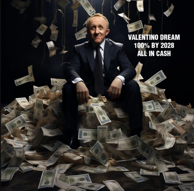 طبق بیانیه مطبوعاتی، فرانسوا هانری پینو قصد دارد تا سال 2028 100٪ از والنتینو را با پرداخت نقدی به دست آورد.