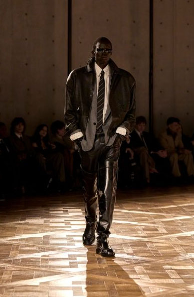 Yves Saint Laurent’s men’s collection integrated leather into clean-cut, retro suits, drawing heavily from photographer Robert Mapplethorpe’s black-and-white art practice built on contrast, clean lines, and restraint. For YSL, the rebellious streak in leather suit pants added an air of shock and effortlessness while maintaining the house’s legacy built on foundational codes. Even in Schiaparelli’s curvaceous silhouettes, which greatly contrast YSL’s signature edgy straight lines, thicker materials served to enlarge the presence of models, granting them an impeccably empowering chutzpah through pieces that bravely stand alone in their complete non-reliance on jewelry