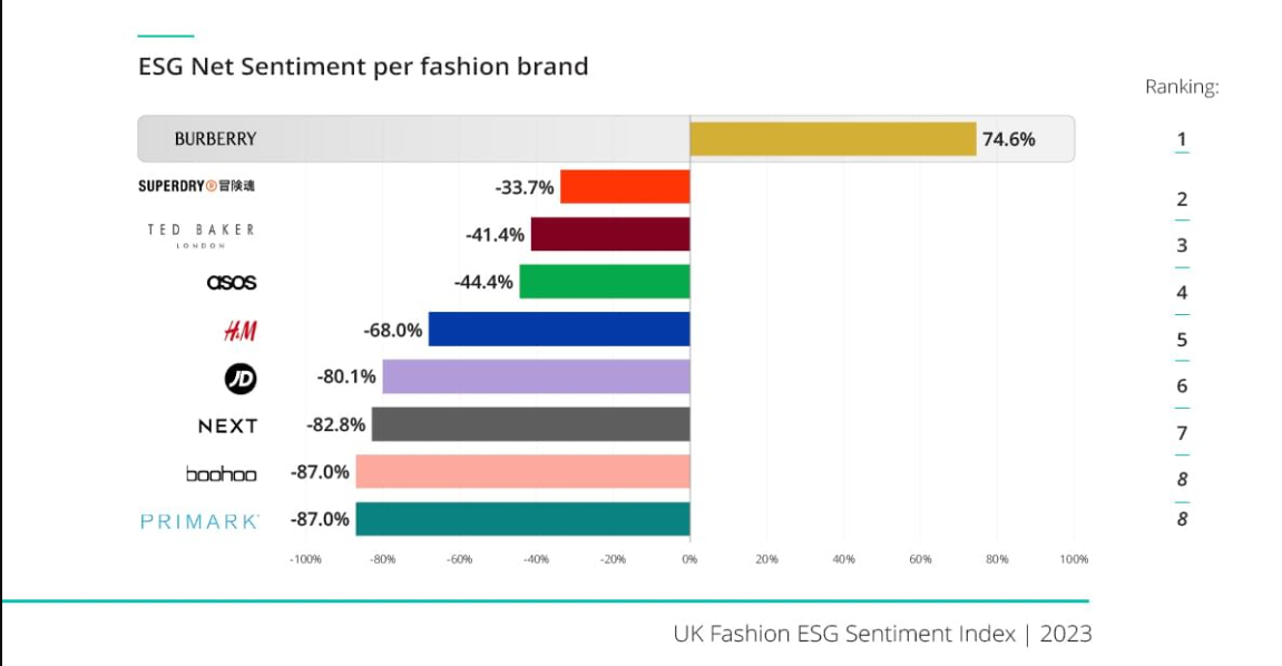 تجزیه و تحلیل نشان داد که برچسب لوکس Burberry به عنوان تنها برند با احساسات خالص مثبت [1] 74.6% در صدر قرار گرفت که نشان دهنده قدردانی شدید مصرف کنندگان از شیوه های مرتبط با ESG است. امتیاز باربری در تضاد کامل با بقیه برندهاست که میانگین احساسات خالص 63.8- درصد بود. شایان ذکر است، Primark و Boohoo در انتهای لیست قرار دارند، با -87٪ امتیاز خالص احساسات.