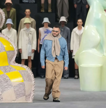Chet Lo همیشه یکی از برجسته ترین طراحان BFC از طراحان New Gen است. این فصل که به خاطر طرحهای بافتنی میخدارش شناخته میشود، یک پیشرفت قوی برای این برند بود. پالت رنگ نسبت به نئونهای معمولی خاموشتر بود - بورگوندی، خاکستری و قهوهای بهشدت در سراسر آن دیده میشد. به ویژه لباس های مردانه برجسته بود. لباسهای بافتنی، کراواتها و خیاطیهای گرافیکی، نسخه بزرگتر مشتری Chet Lo را نشان میداد، با ظاهری آماده برای دفتر که هنوز حس بازیگوشی طراح را حفظ کرده بود. در کنار روسری های پهن، ست های هماهنگ و لباس های گلدار، این ممکن است قوی ترین و منسجم ترین مجموعه او تا به امروز باشد.