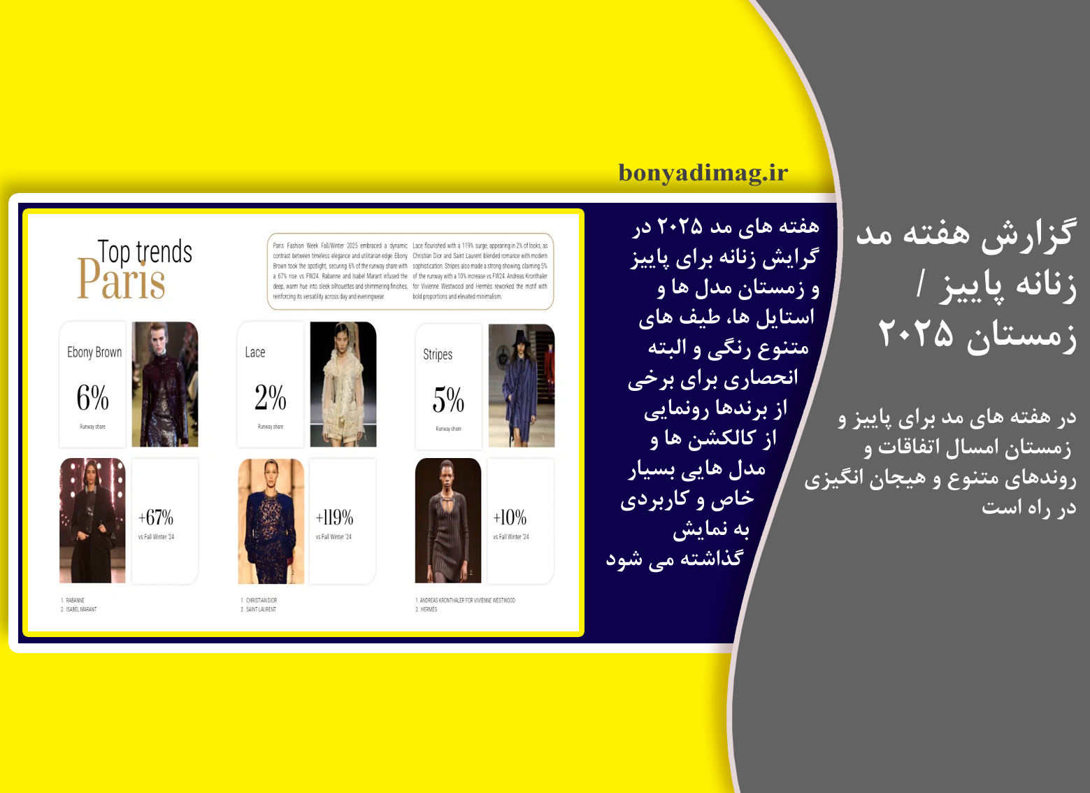 گزارش هفتههای مد زنان پاییز/زمستان 2025، روندهای برجستهای را که در نیویورک، لندن، میلان و پاریس دیده میشود، برجسته میکند. این فصل با بیان شخصی تعریف میشود. مضامین کلیدی شامل Rockstar Seduction، The Chic Cavalier، Undone Cooleach و Wild Opulence است که هر کدام پارچهها، رنگها و طرحهای منحصر به فردی را به نمایش میگذارند که فصل آینده را تعریف میکنند.
