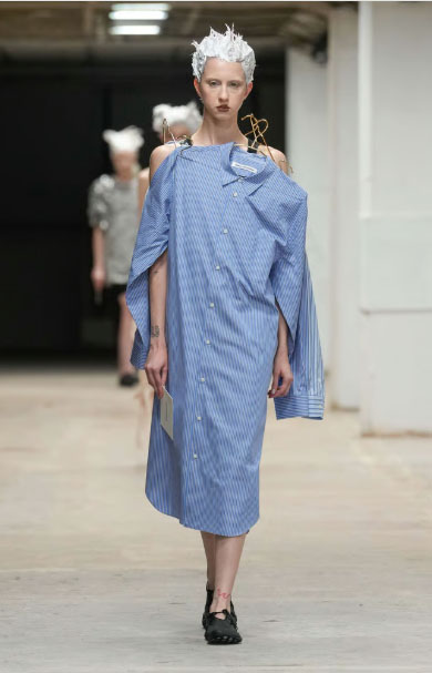 نتیجه همزمان سورئال و بازیگوشانه بود. چترهای توری سفید قدیمی مانند یک تاج گل در لبه یک لباس تابستانی باز شده بودند، در حالی که دستهای از کلاههای حصیری، حجمی چیندار در یقه و روی شانههای یک لباس شب بلند با توری گیپور به رنگ برهنه ایجاد کرده بودند.