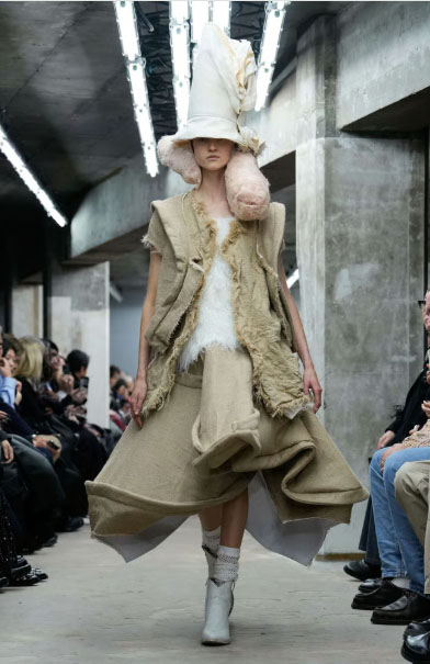 این لباسهای مجسمهای، که با بازی لایهبندی، حجم و تکنیکهای بالشتک ایجاد شده بودند، به کل حس وقار میبخشیدند. این مدلها که با کلاههای سیلندری کهنه و موهای نخی در سایههای پاستلی پوشیده شده بودند، عروسکهای پارچهای یا عجوزههای قدیمی یا جادوگران را تداعی میکردند که در ژانویه در دوران باستان در حومه شهر سوزانده میشدند تا سال گذشته را به استراحت بگذارند و فصل جدید غنیتر و فرخندهتری را جشن بگیرند.