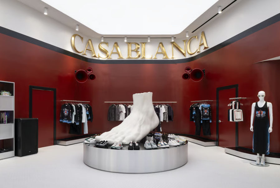 در داخل فروشگاه، یک سیستم صوتی سفارشی طراحی شده توسط Void، موسیقی را به بخش اصلی هویت برند کازابلانکا تبدیل میکند. در مرکز، یک پای بزرگ تراشیده شده، حرکت و ورزش را منعکس میکند. یک دیوار قرمز کارمین و مبلمان فلزی برس خورده عتیقه و مدرن، دکوراسیون را غنیتر میکنند. فضاهای دلباز با فضاهای صمیمیتر که توسط چند ستون یونانی مشخص شدهاند، جایگزین میشوند.