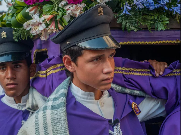 در طول عید پاک در گواتمالا، کاتولیک ها هفته مقدس را با نمایش روزهای منتهی به مصلوب شدن و رستاخیز مسیح جشن می گیرند. در مراسم صلیب مقدس در روز جمعه خوب، مردان و پسران به نشانه عزاداری و نشانه ای از درد و رنج مسیح، لباس های بنفش و مقنعه می پوشند.